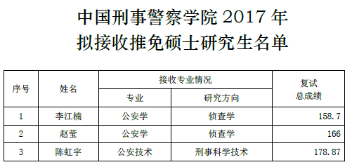 中国刑事警察学院2017年拟接收推荐免试硕士研究生名单公示