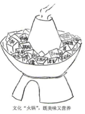 The enlightening picture portrays that a hot pot, with numerous ingredients in it, includes such domestic and alien cultures as literature, moral values and performing arts. It seems that the hot pot tastes very delicious because of the rich nutrition of the multi-cultures.